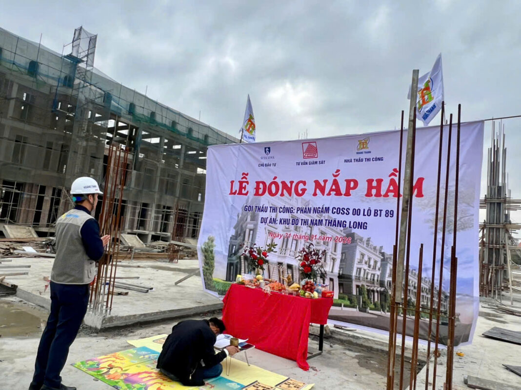 Ngày 31/01/2026, tại Dự án Khu đô thị Nam Thăng Long (Ciputra), Lễ đóng nắp hầm gói thầu thi công phần ngầm COSS 00 – Lô BT 89 đã được tổ chức trang trọng với sự tham dự của Chủ đầu tư, Tư vấn giám sát, Nhà thầu thi công cùng các đơn vị liên quan.