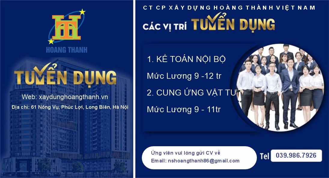 Để đáp ứng nhu cầu mở rộng sản xuất kinh doanh, Công ty Cổ phần Xây dựng Hoàng Thành thông báo tuyển dụng một số vị trí quan trọng.Chúng tôi tìm kiếm những ứng viên có tinh thần trách nhiệm, nhiệt huyết và mong muốn gắn bó lâu dài.